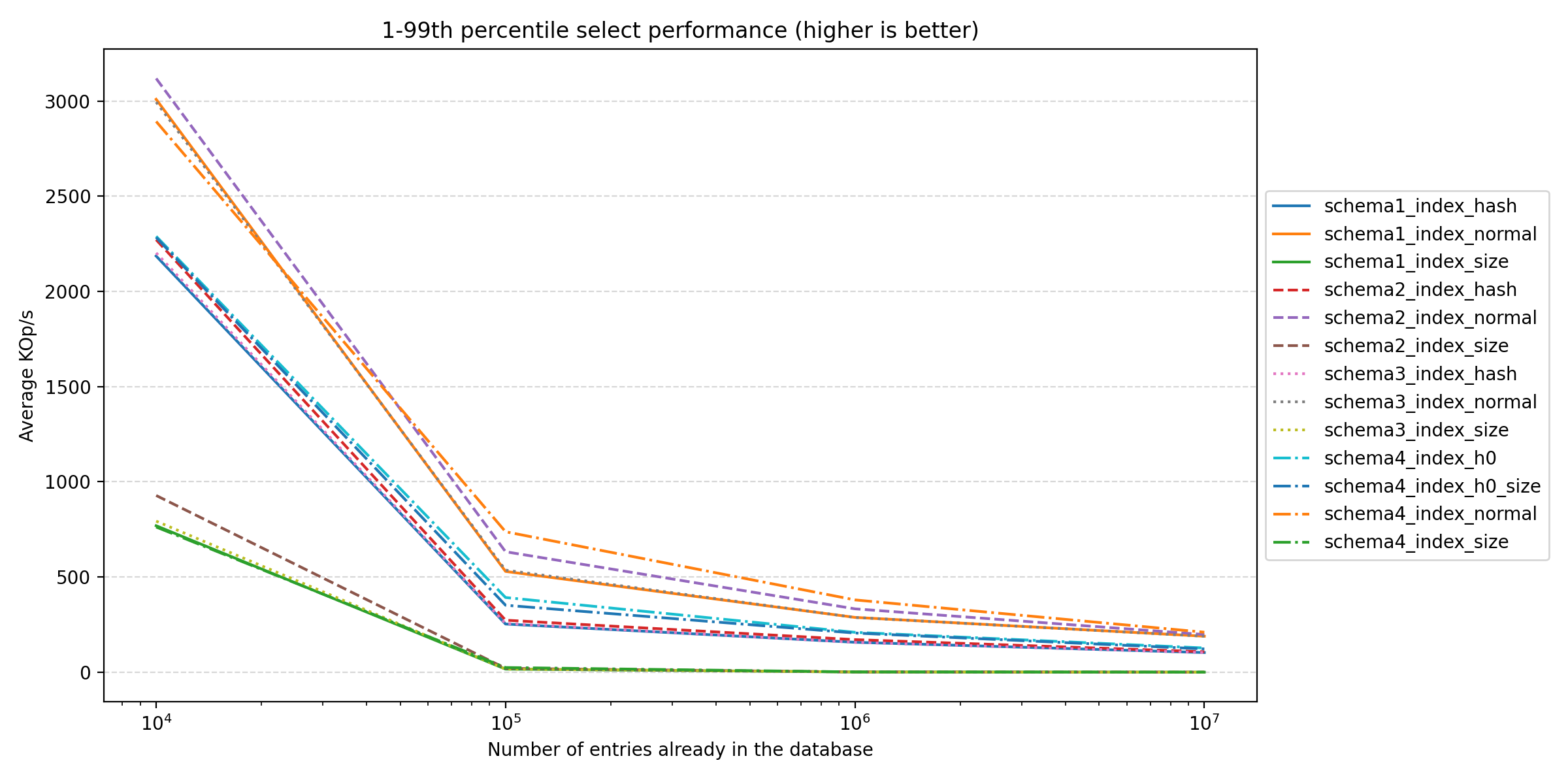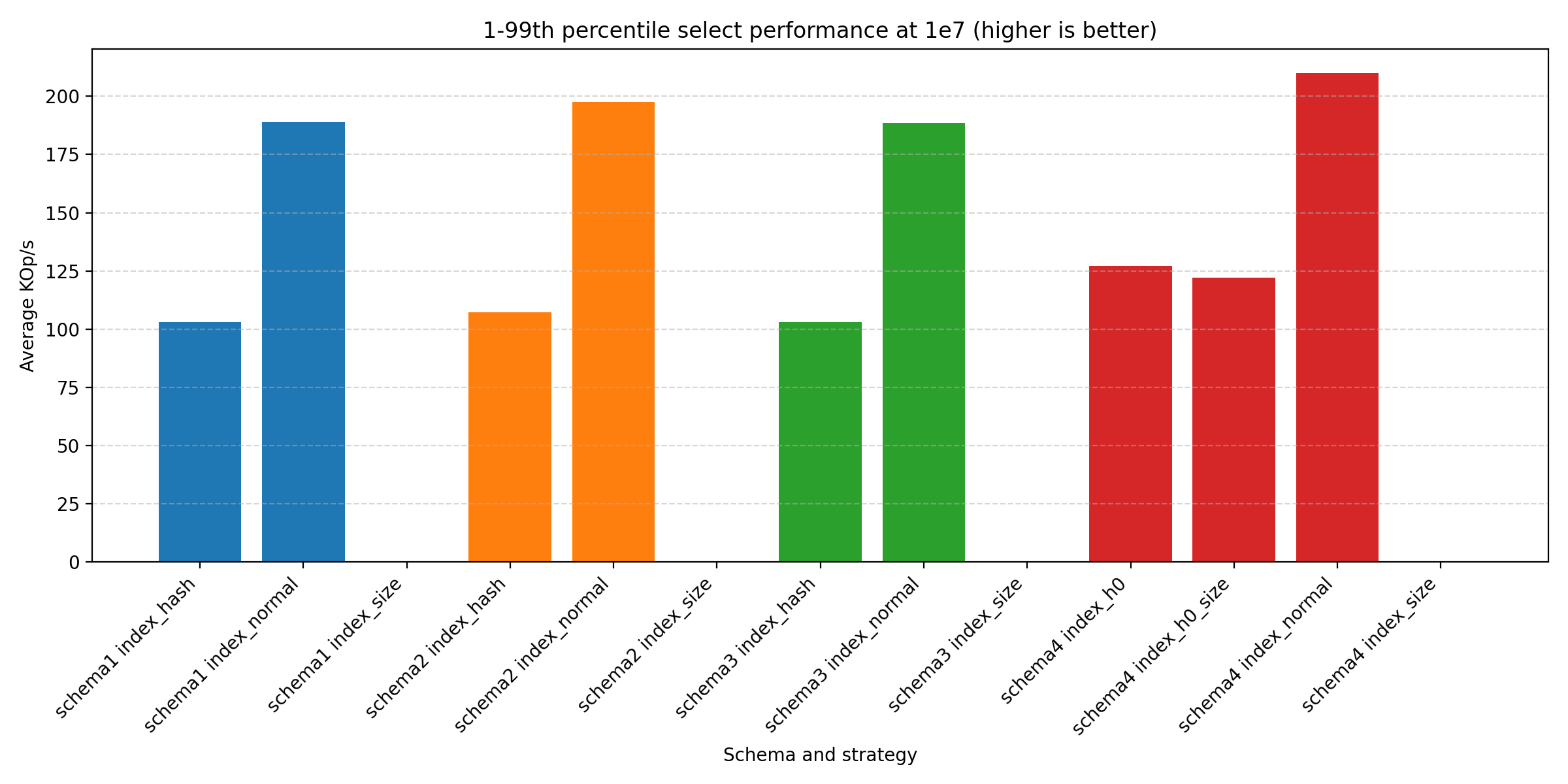 The bars for the size-based indexes are there, but are too small to properly render on the image. The hash-based ones also perform quite poorly. So for a select heavy workload, the normal indexes are the way to go. The winner is the (10.) schema, which is about 20 % faster than (1.), meaning there could be some, but not much, value in changing to this scheme. There are two reasons behind its performance:
