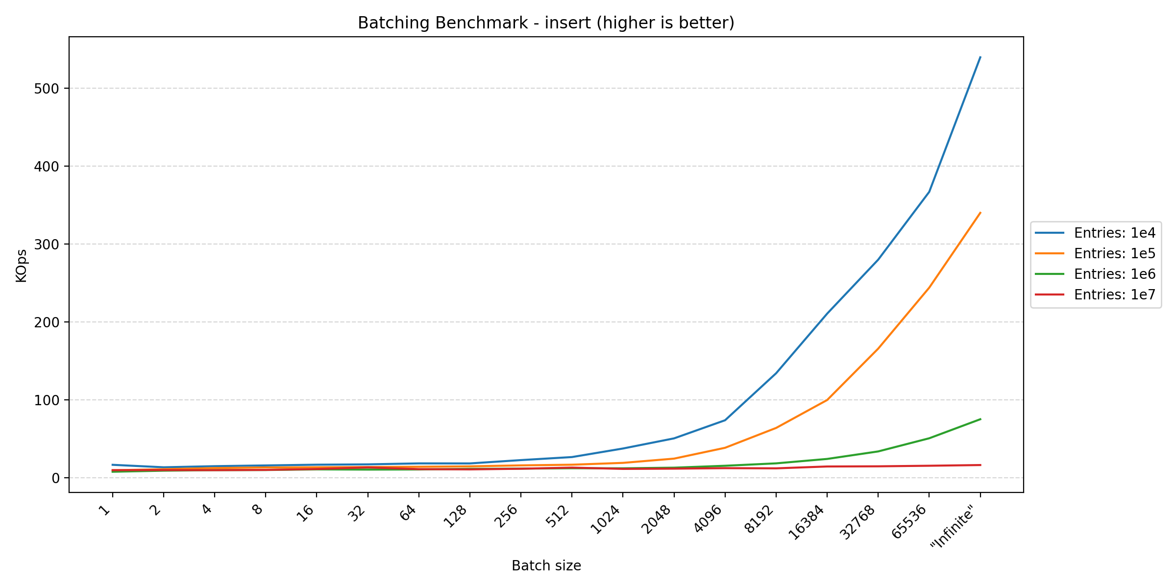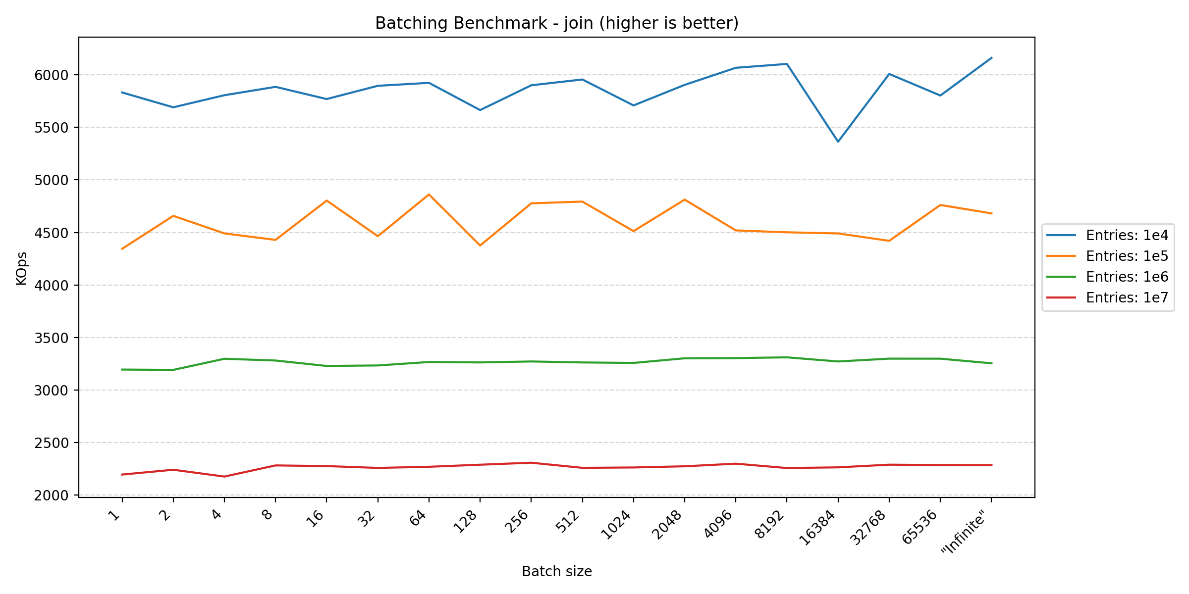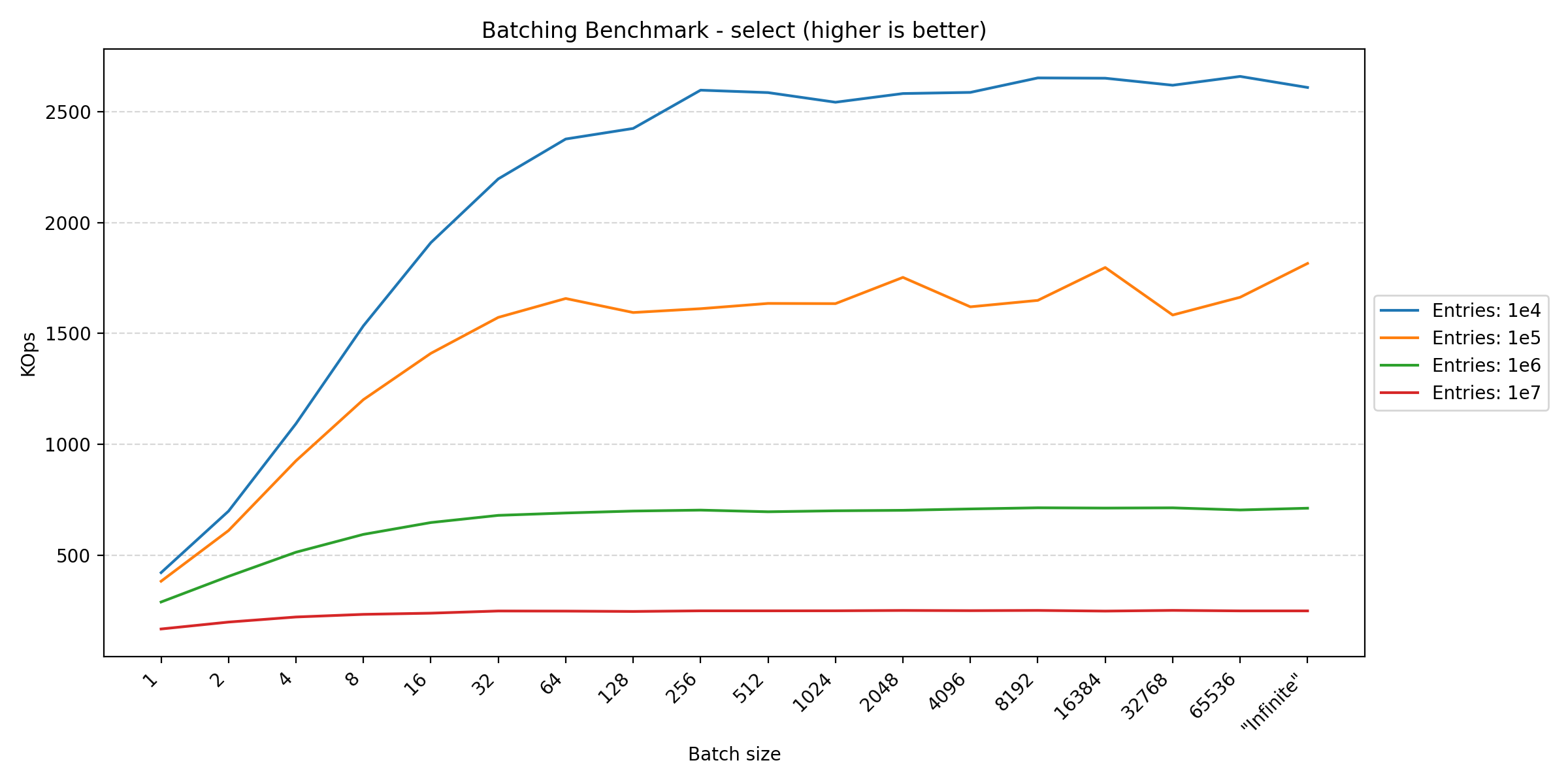 Here we see that anything that writes data benefits from larger batch sizes, as this reduces the overhead of transaction management. However, for read-heavy operations, the performance tends to plateau around 256. The fact that the join benchmark seems unfazed by batch size makes sense, as each statement already affects multiple rows, reducing the impact of transaction overhead.