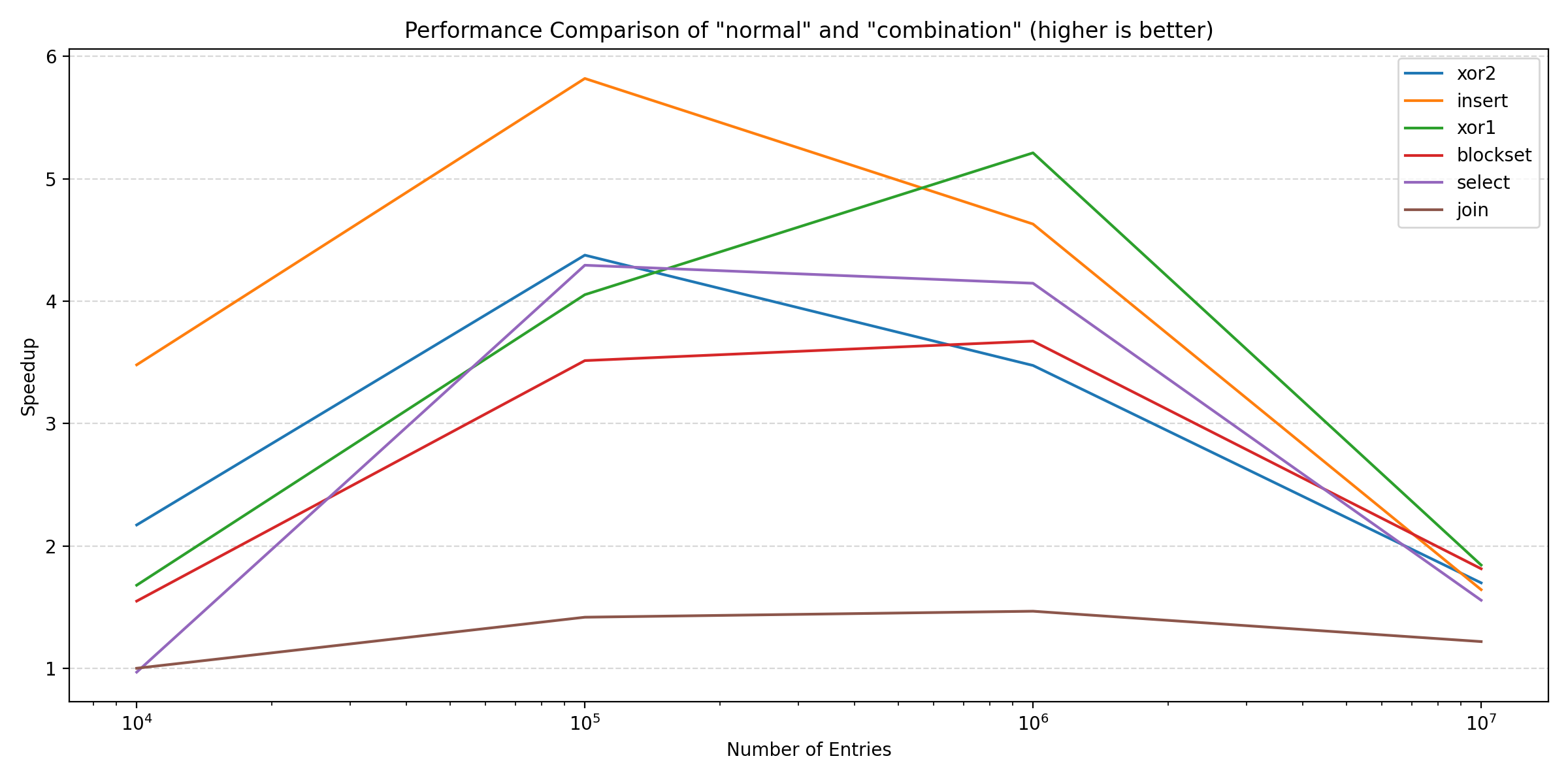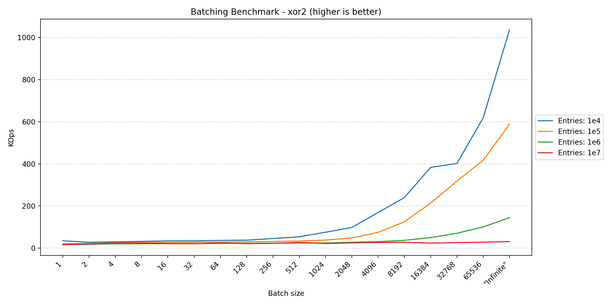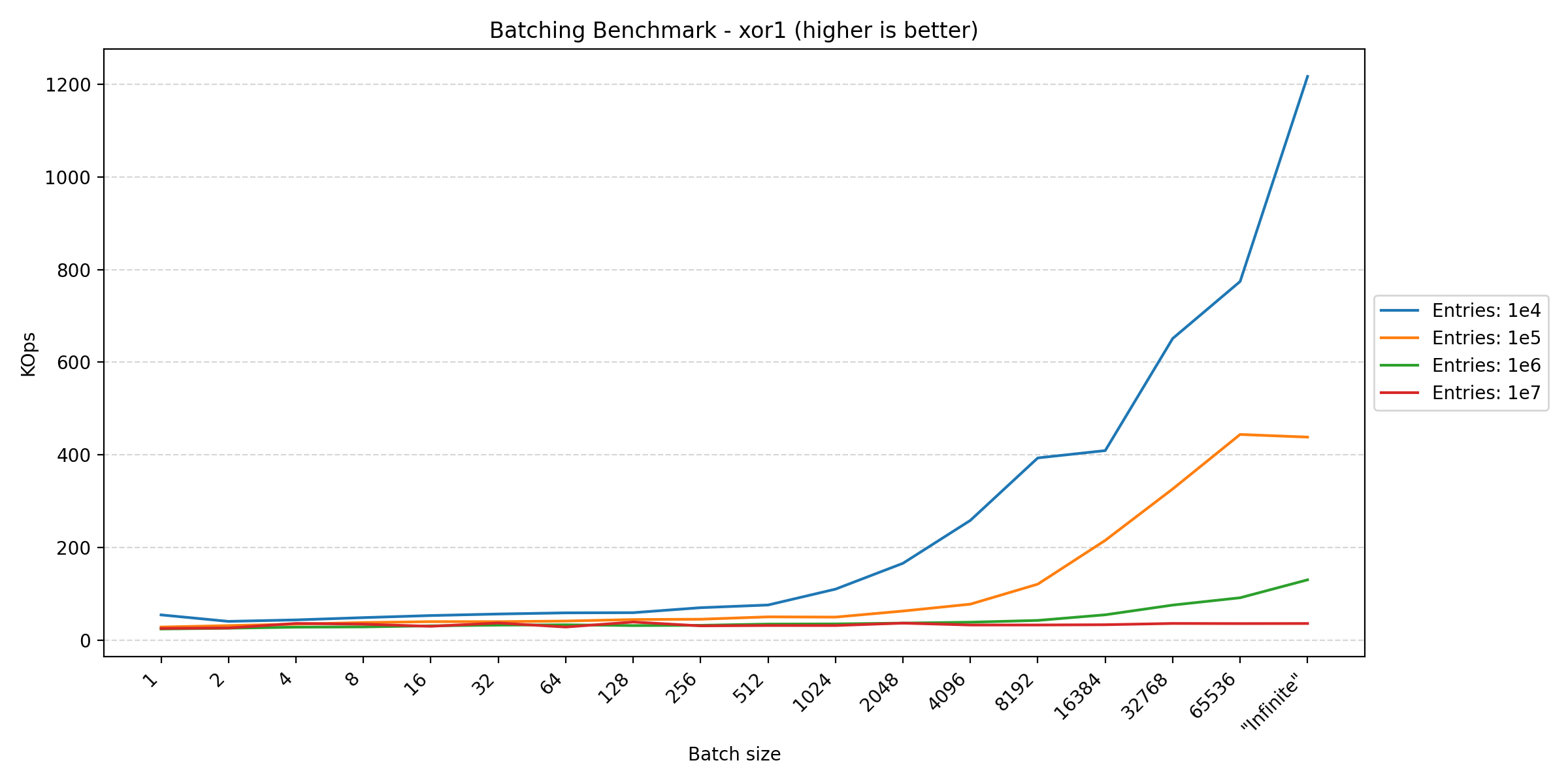 Here we see that anything that writes data benefits from larger batch sizes, as this reduces the overhead of transaction management. However, for read-heavy operations, the performance tends to plateau around 256. The fact that the join benchmark seems unfazed by batch size makes sense, as each statement already affects multiple rows, reducing the impact of transaction overhead.