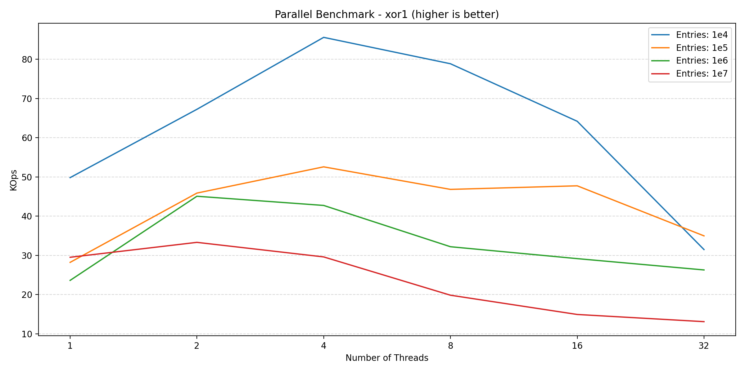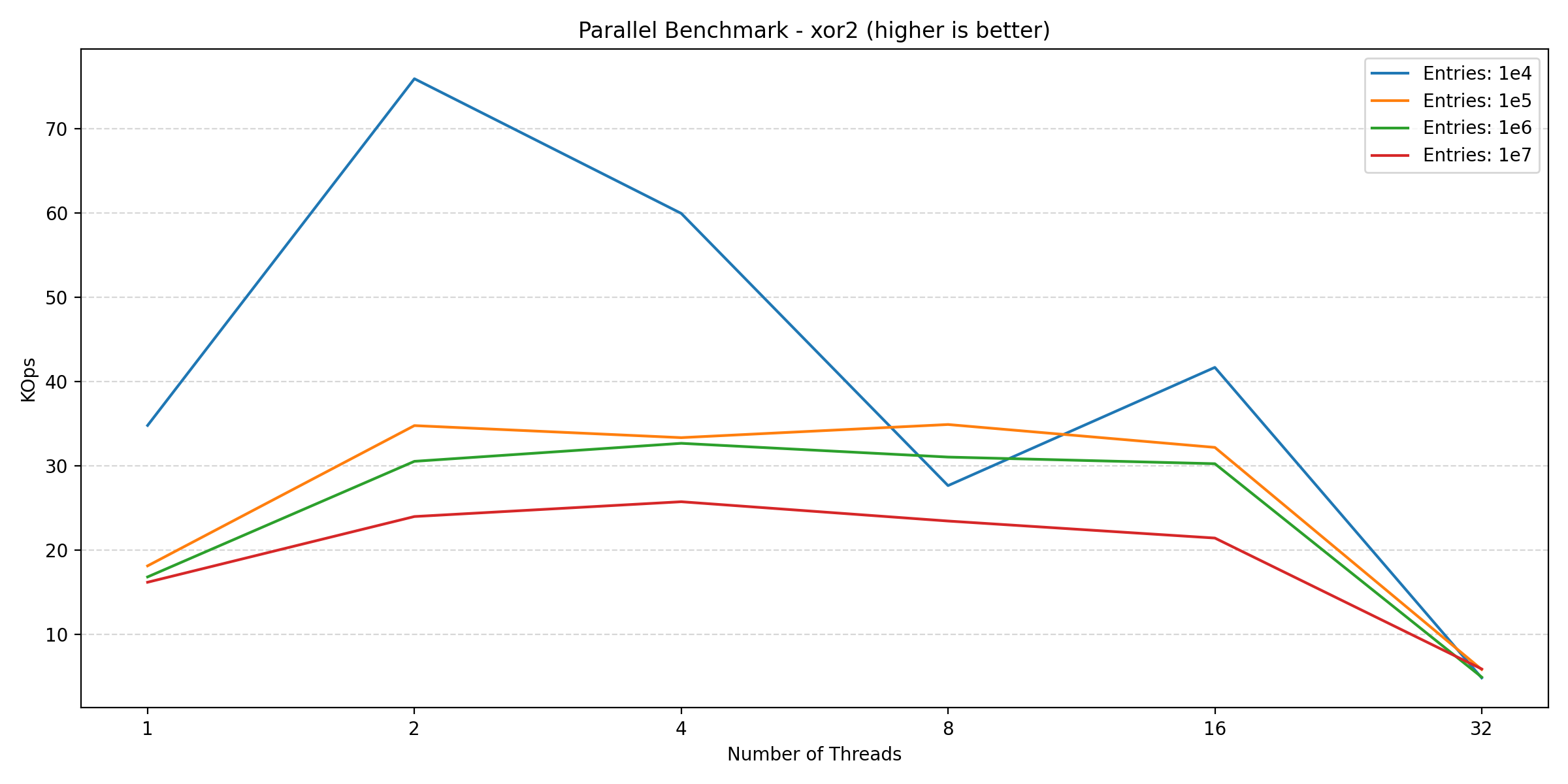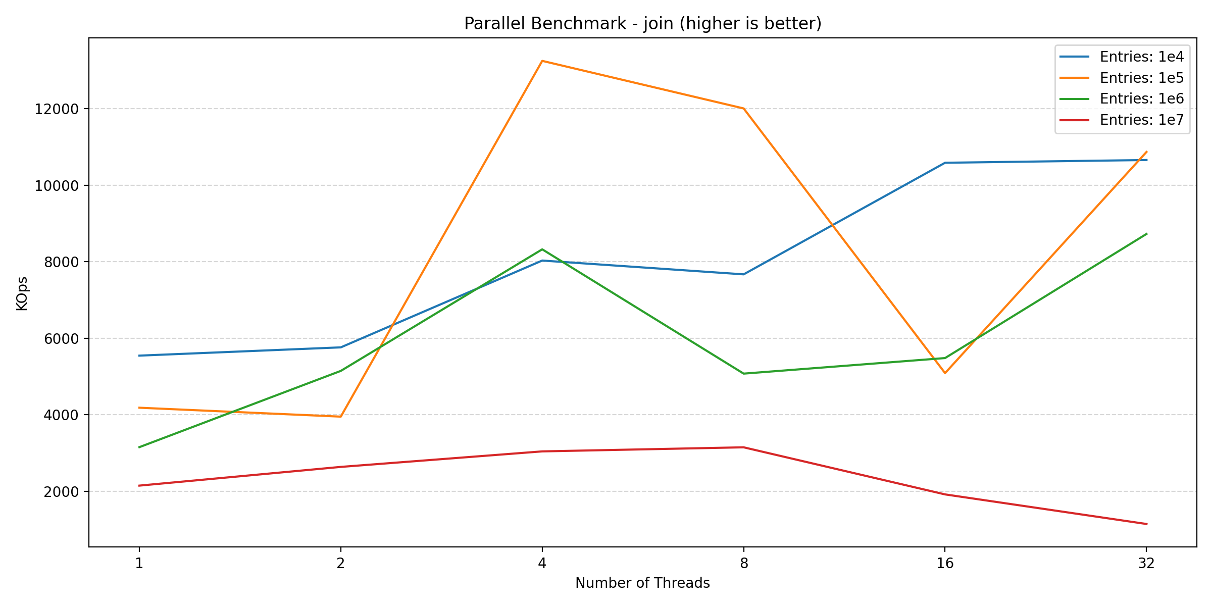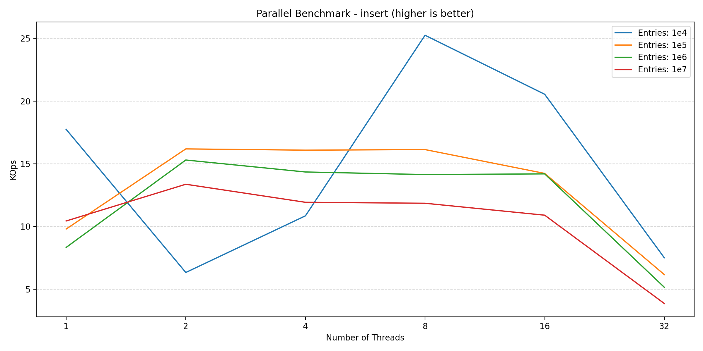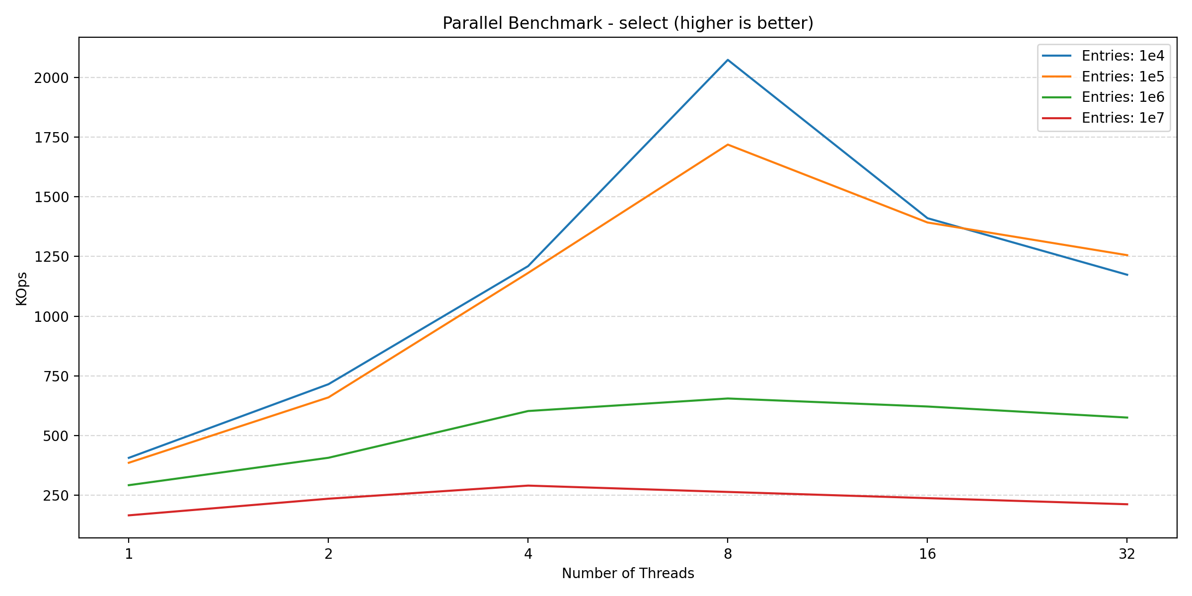 Here we see that both benchmarks benefit from parallelization, scaling nicely along with the number of threads until reaching the saturation point around 8 threads. While these two plots could indicate that parallelization is worth it, looking at the write-heavy benchmarks shows a different picture: