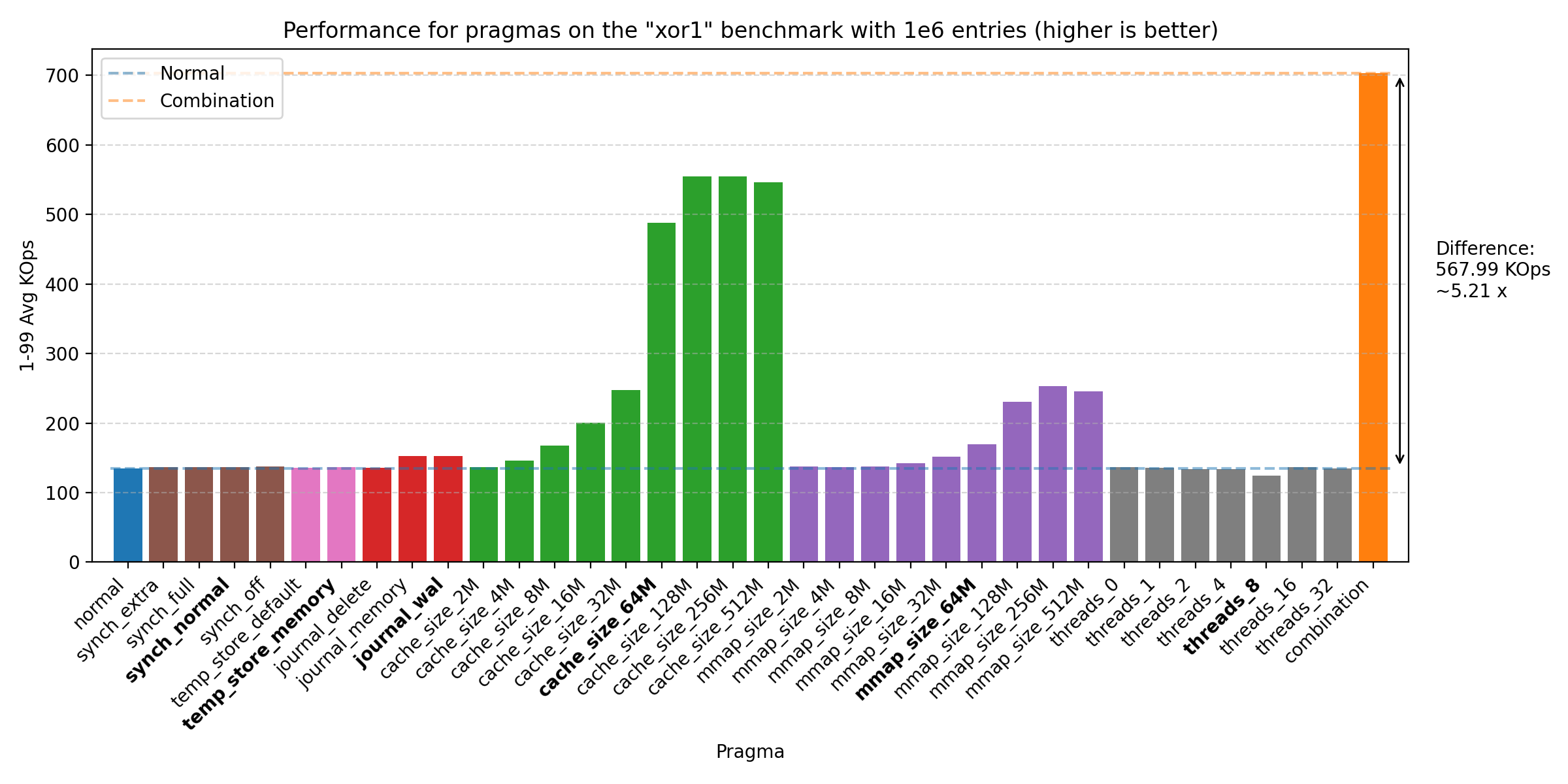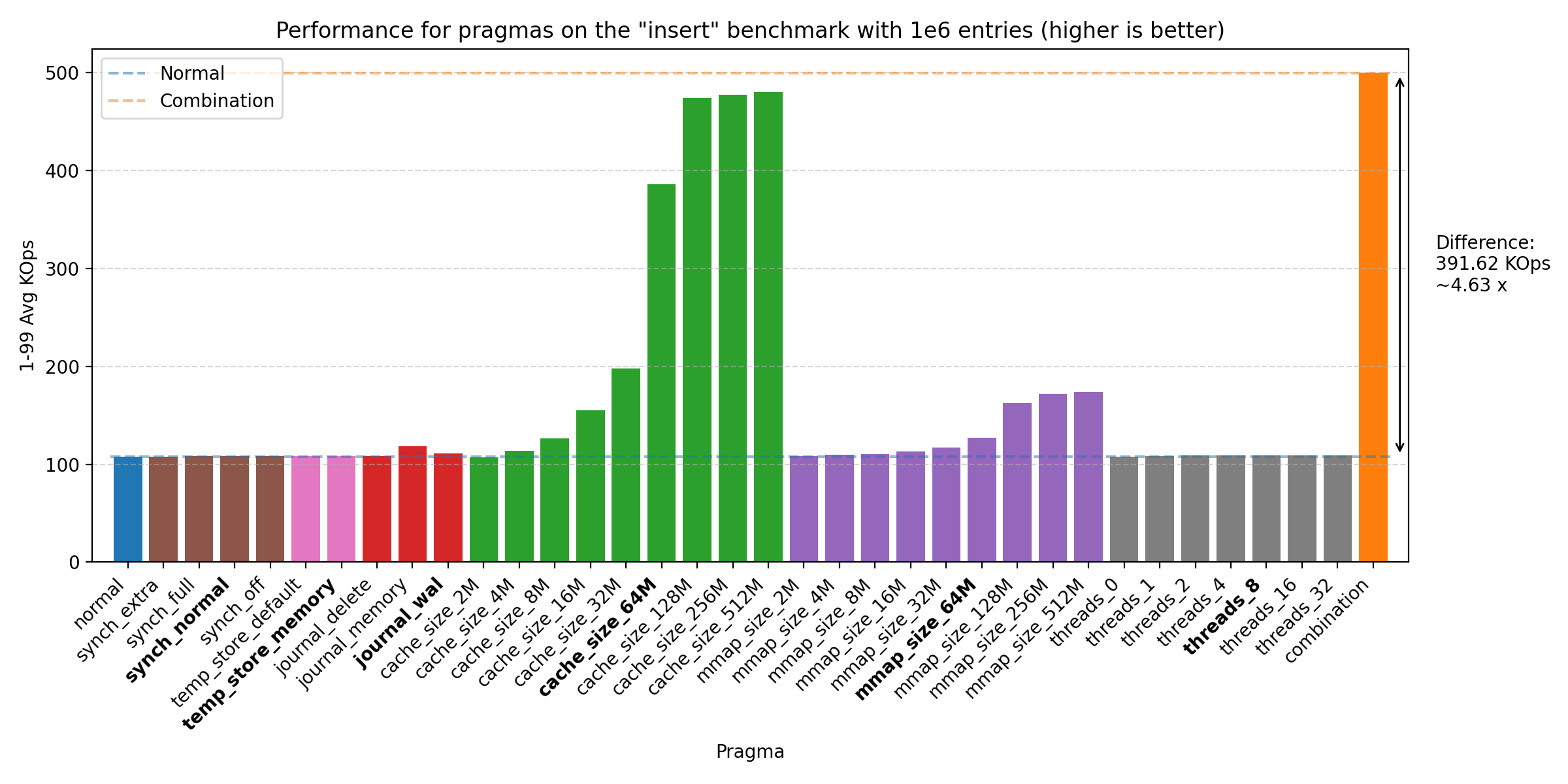 In addition to these individual PRAGMAs, we’ll also test the normal behaviour (no pragmas), as well as a combination of reasonable configurations: synchronous NORMAL to slightly slack the durability in exchange for performance, temp_store MEMORY as temp stores are removed after a run anyways, journal_mode WAL to improve performance and concurrency, cache_size 64M for a slight (on modern machines) increase in memory consumption, mmap_size 64M for better I/O performance, and threads 2 as the plots will show that being the sweet spot.