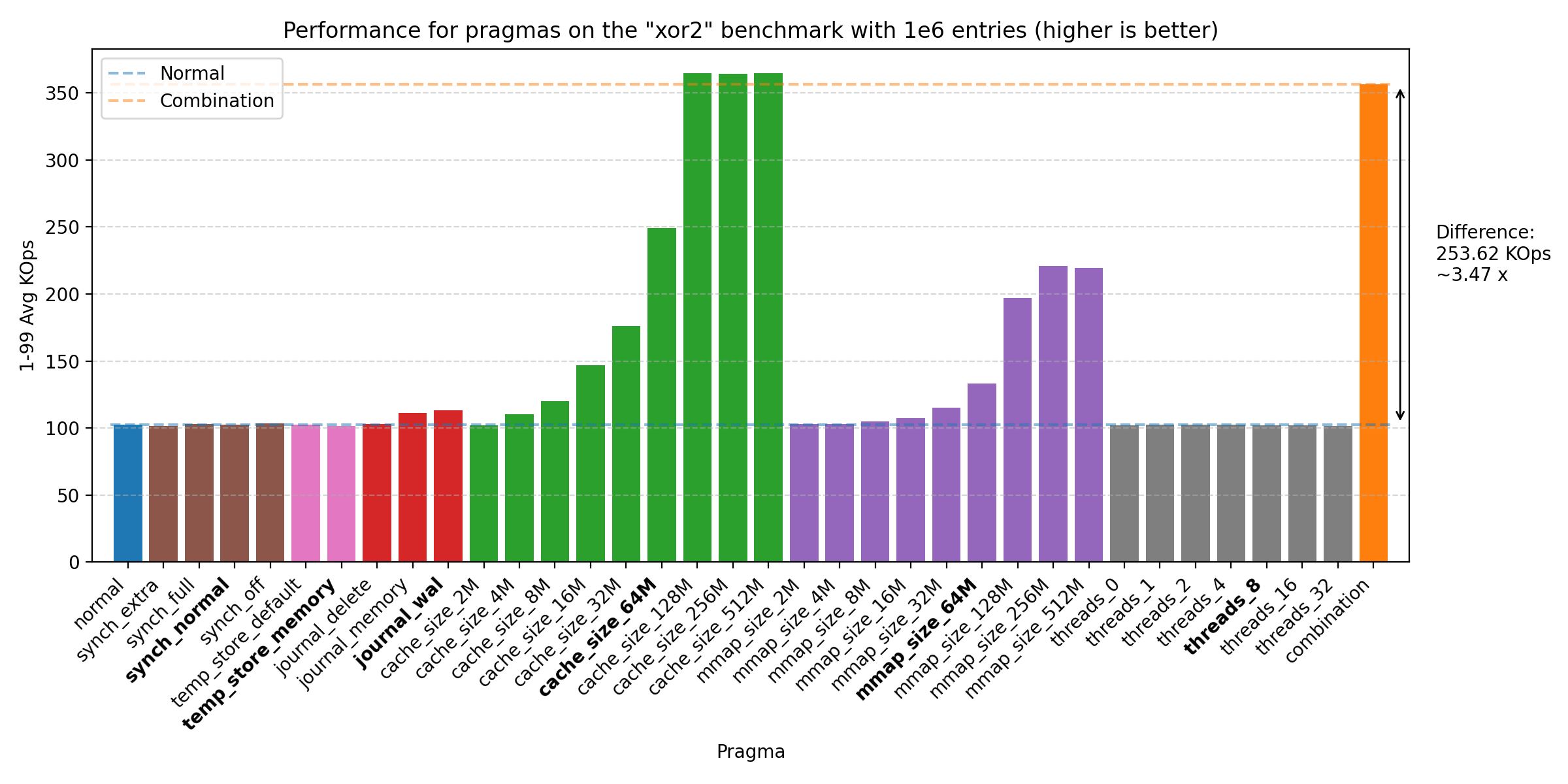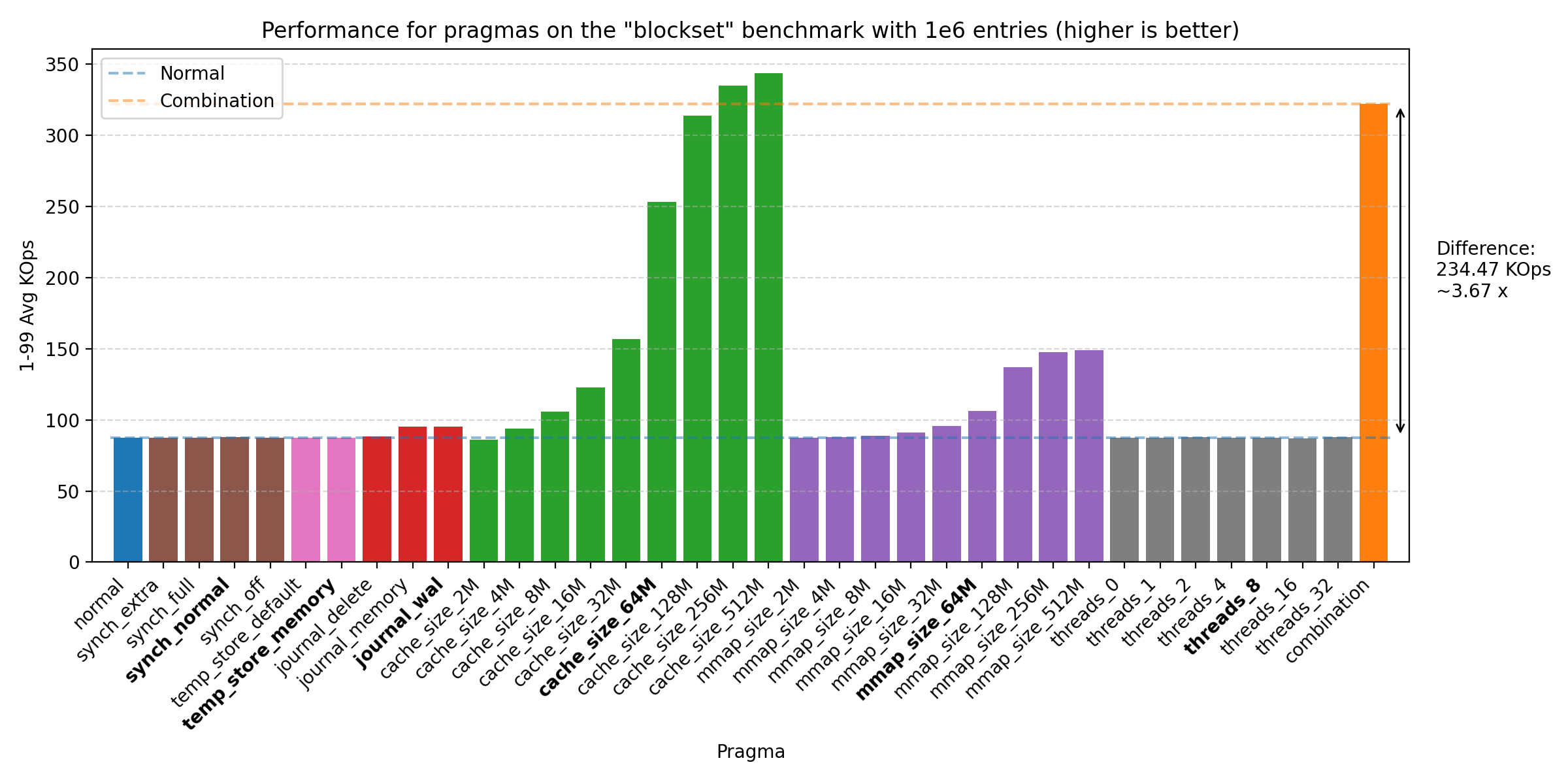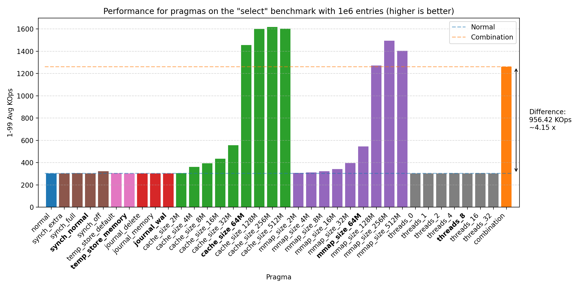 We’ve run the benchmarks with the same sizes as before, but the biggest impact of the PRAGMAs was seen on 1e6 entries: