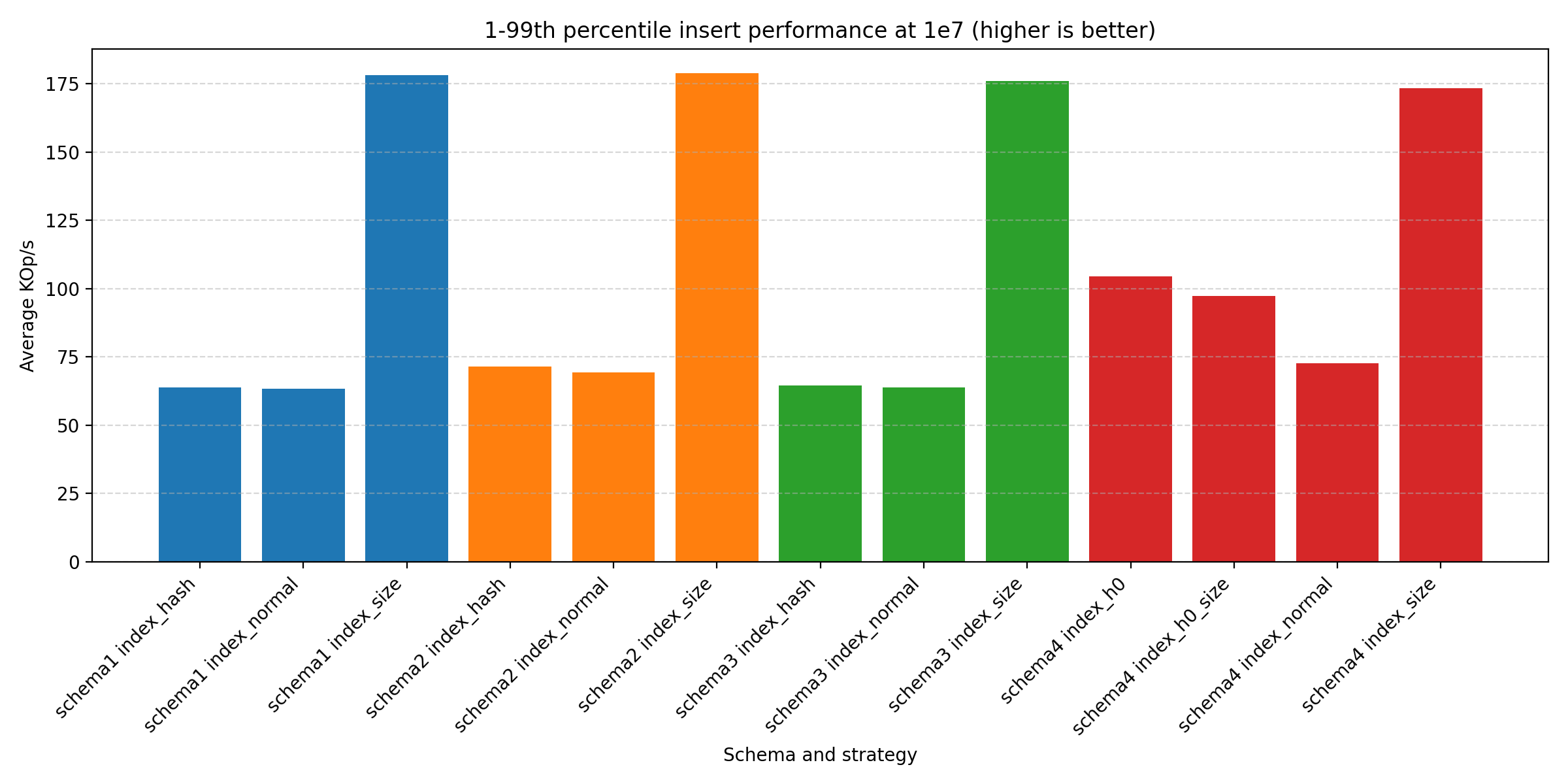 Size-based indexes consistently outperform the others. This makes sense, as there’s less work in maintaining the overall index, leading to most inserts ending up in the same bucket. The next two winners are the schema 10 with index on either (h0) or (h0, size), with the same argument as before to why they’re performant. The rest are grouped towards the bottom, with the original (1.) schema performing the worst. If we focus on the largest run: