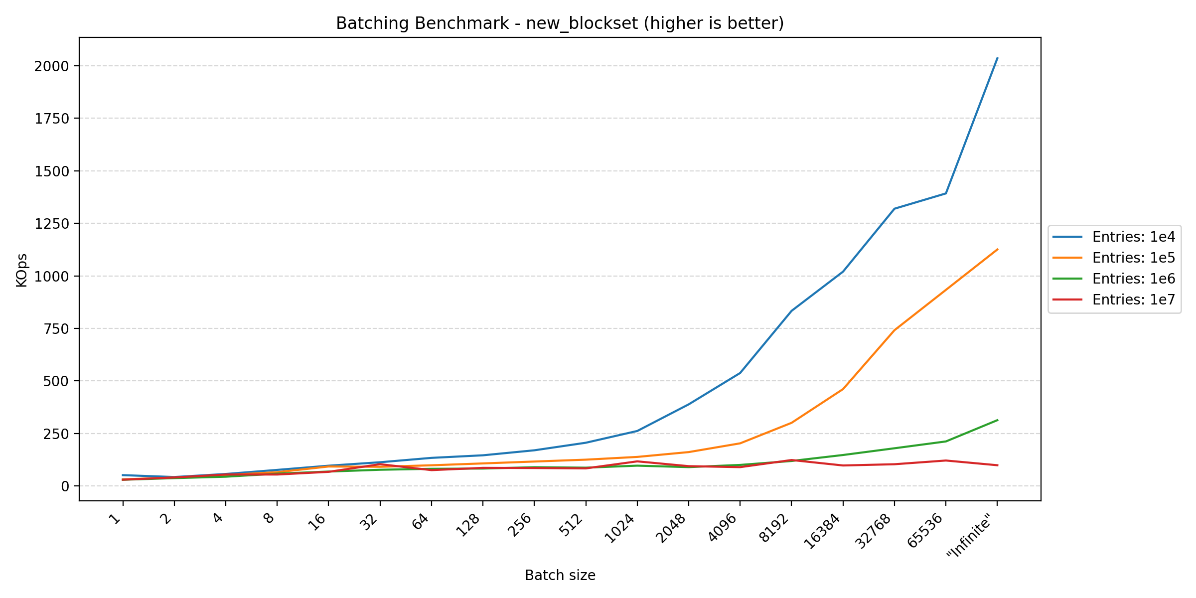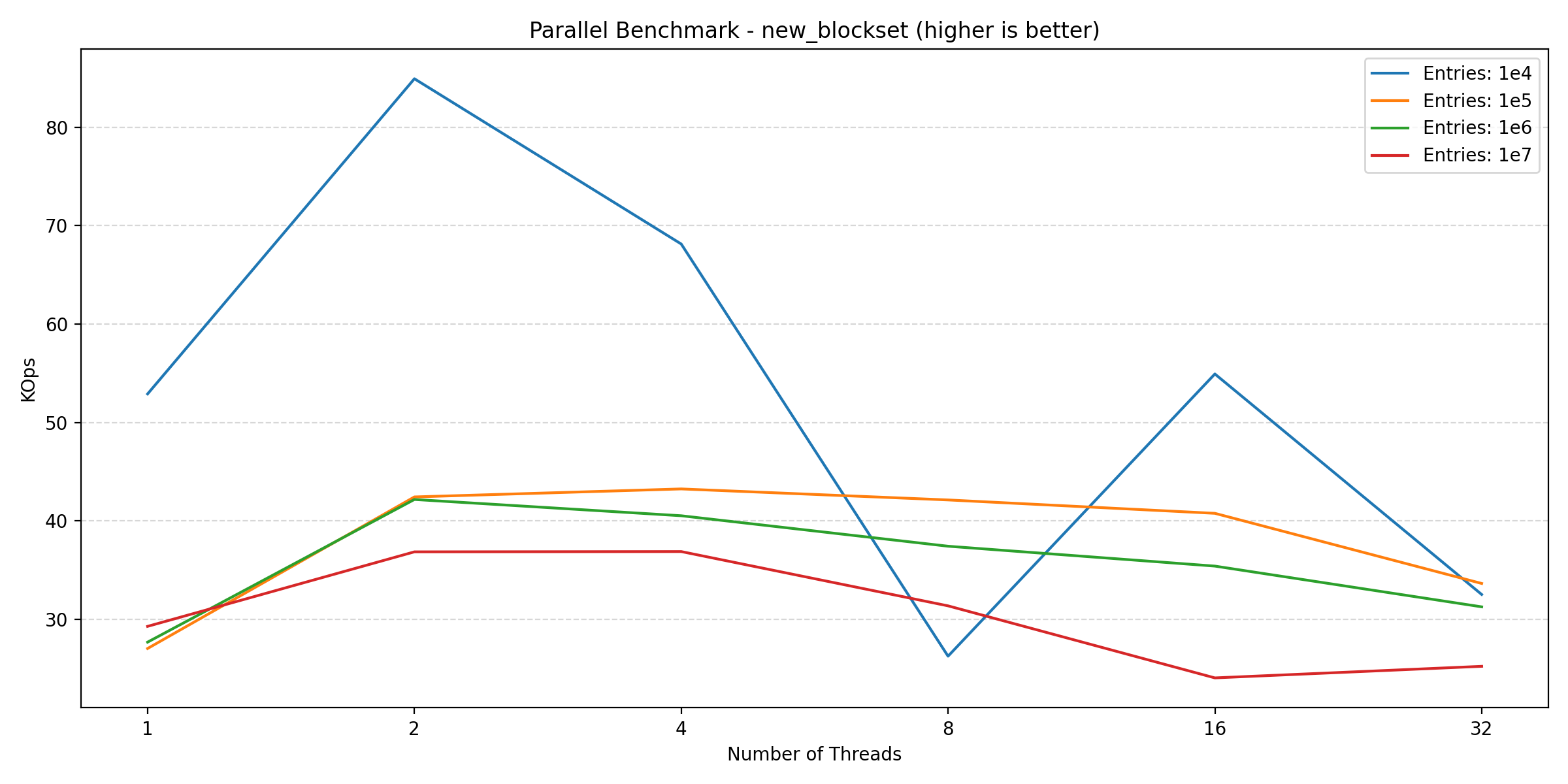 Here we see an increase going from 1 to 2 threads, but adding more threads after this point hurts the performance. This is likely due to lock contention inside of the database engine, which is expected. Finally, looking at the new blockset benchmark (which is a mix of read and write):