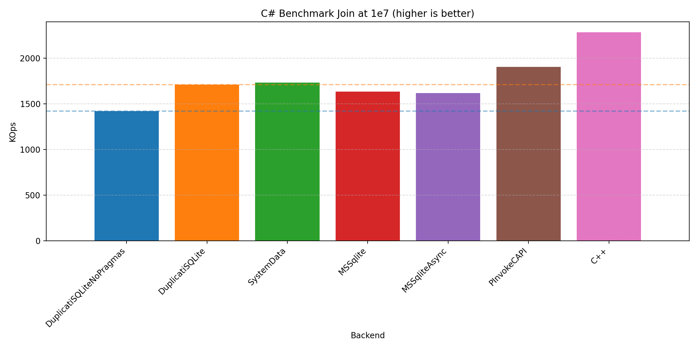Across the plots we see that the different C# backends have varying strengths: PInvoke generally performs the best, Duplicati and System.Data performs best on join, with Microsoft.Data.Sqlite performing well on all of them.
