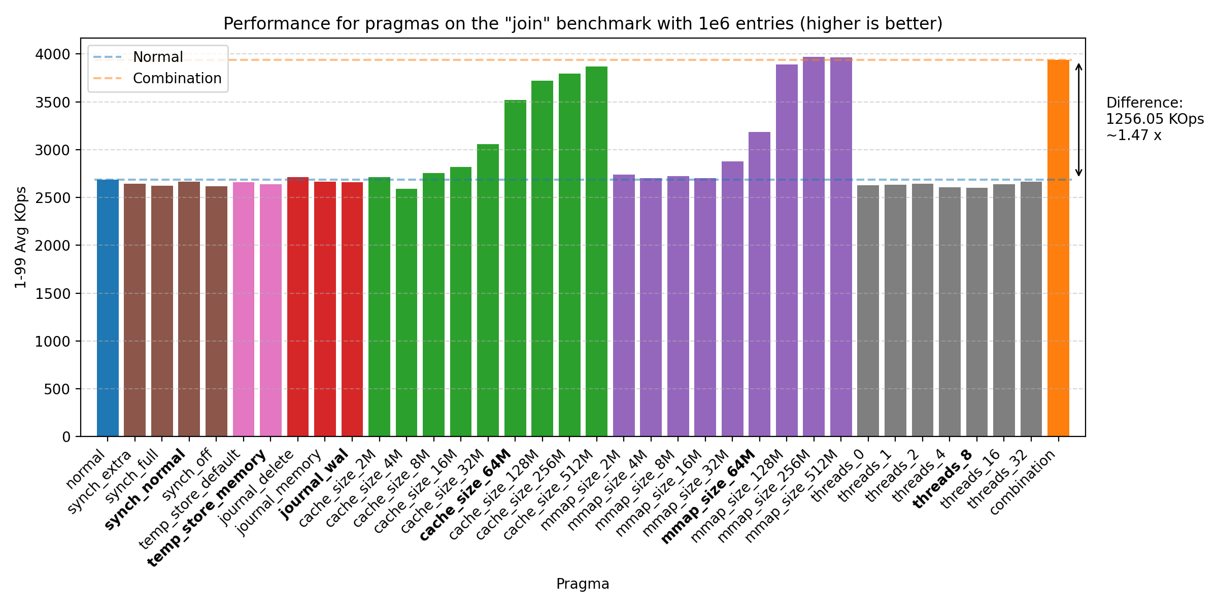 All of these plots show great performance gains, 1.47 - 5.21 times improvement over the baseline. The biggest improvements were seen with cache_size, then mmap_size, and finally journal_mode. The reason why the join benchmark has a lower improvement is likely due to the benchmark already being very fast (notice the y-axis scale changes across plots). We do see that there could be further improvement by increasing the sizes of cache_size and mmap_size, but setting both at 64M seems to be a good balance. We also see some improvement from threads, but the effect is quite small on all but the mac machine, where it seems to have a larger effect. Therefore, we choose the default as 8, as the effect is negligible on the other machines, but does provide some improvement on the mac machine.