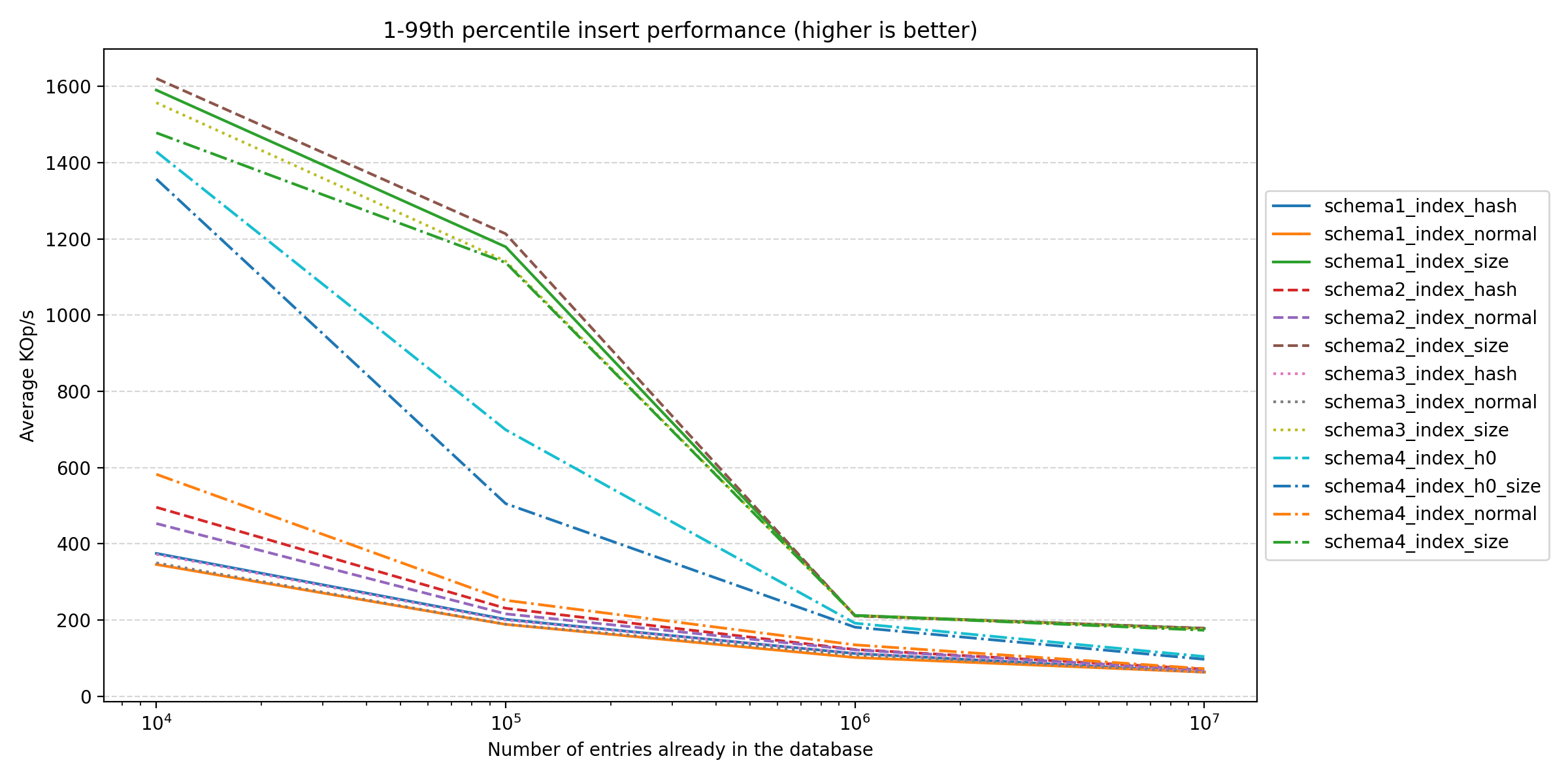 These variations lets us test whether changing the schema or indexes can improve performance. For each variation we adapt the insert and select queries to match the schema and index according to the specification. Let’s start by looking at the performance of insert: