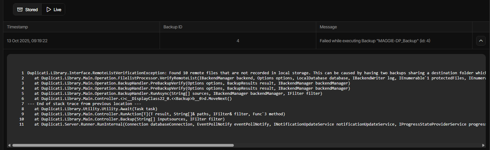 Details: Duplicati.Library.Interface.RemoteListVerificationException: Found 10 remote files that are not recorded in local storage. This can be caused by having two backups sharing a destination folder which is not supported. It can also be caused by restoring an old database. If you are certain that only one backup uses the folder and you have the most updated version of the database, you can use repair to delete the unknown files.