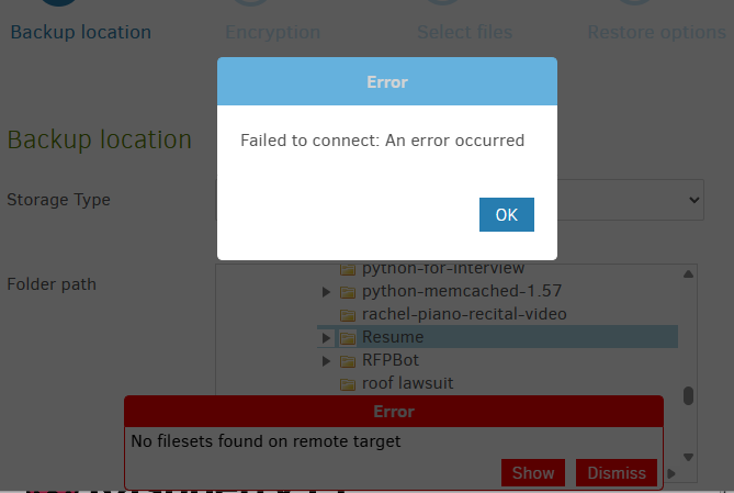 At this point I’m in the wizard and step 1 is “Backup location”. I use the Folder path dialog to navigate to the “Resume” folder on my main C drive
