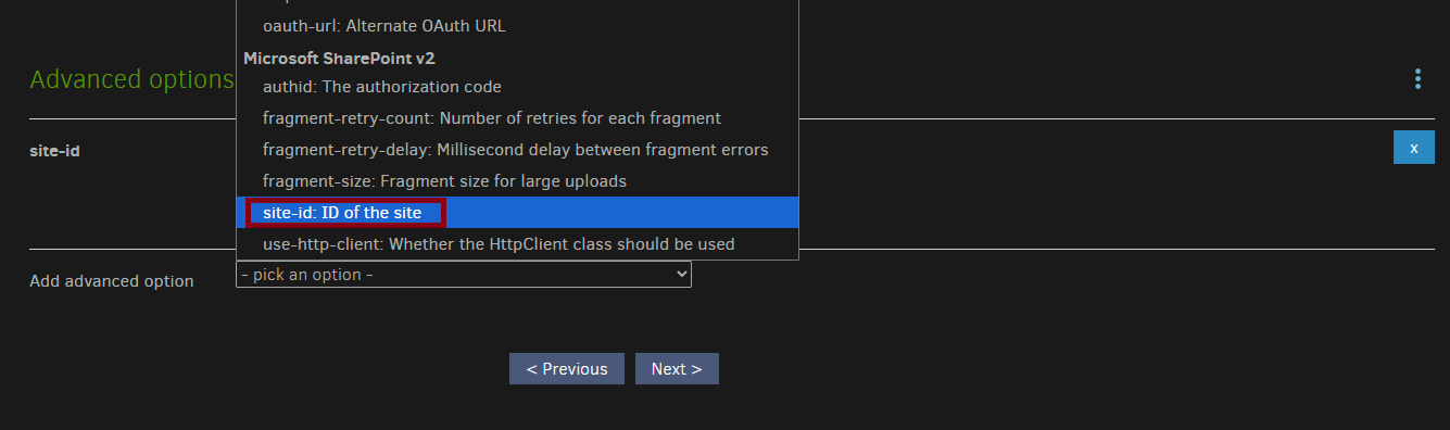 --site-id (String) ID of the SharePoint site to store data in. This parameter is required when using the relative document library path (without specifying the SharePoint site’s web address). This ID can be looked up by querying in the Microsoft Graph Explorer. When the SharePoint site’s full web address is provided, it is looked up automatically.
