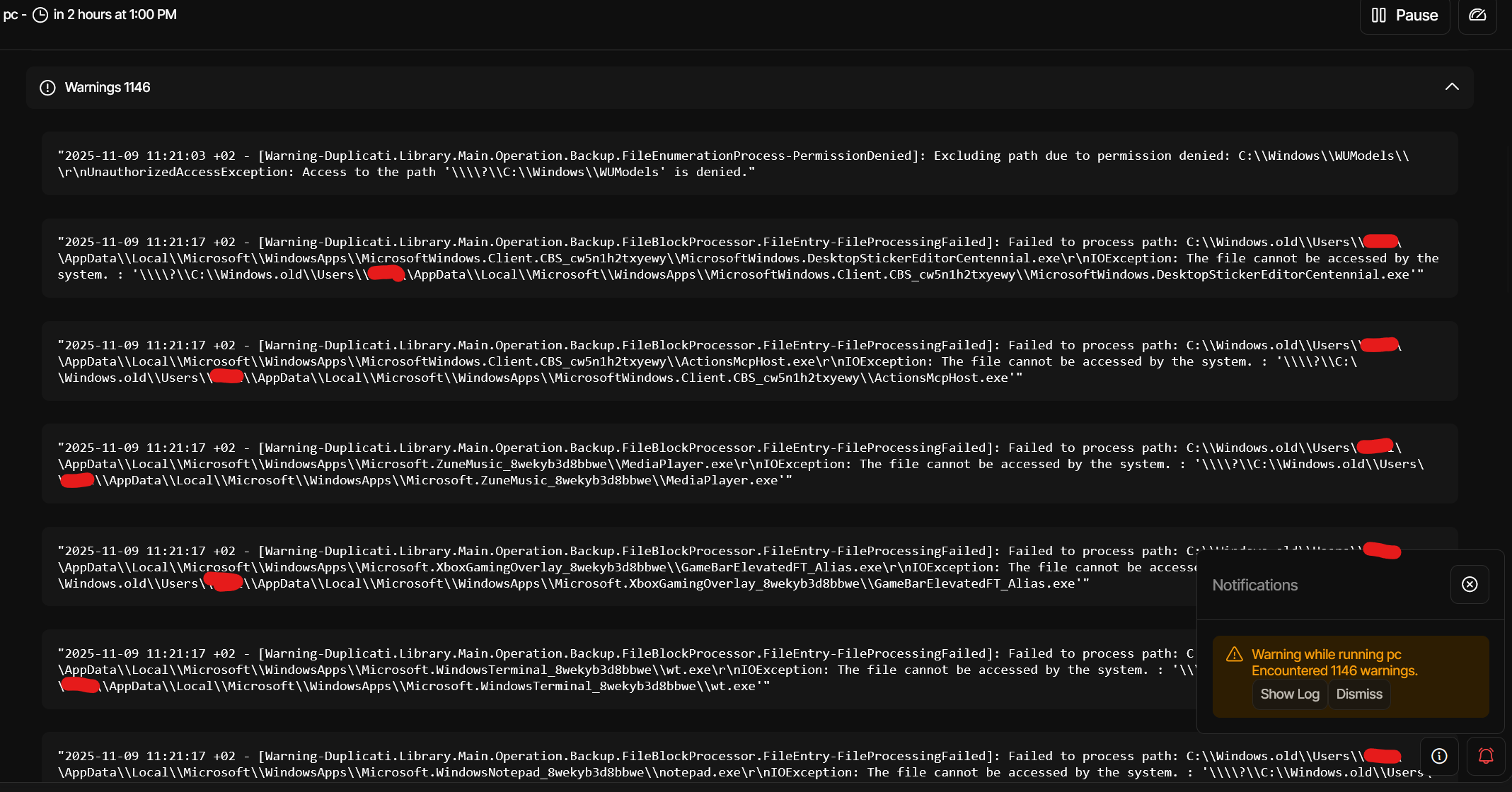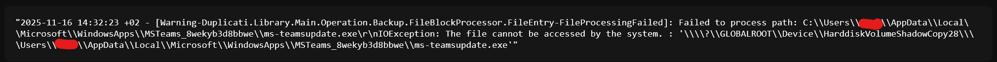 "2025-11-18 19:18:18 +02 - [Warning-Duplicati.Library.Main.Operation.Backup.FileBlockProcessor.FileEntry-PermissionDenied]: Excluding path due to permission denied: C:\\hiberfil.sys\r\nUnauthorizedAccessException: Access to the path '\\\\?\\GLOBALROOT\\Device\\HarddiskVolumeShadowCopy25\\\\hiberfil.sys' is denied."