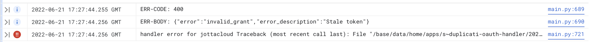---> (Inner Exception #0) System.AggregateException: Failed to authorize using the OAuth service: Server error. If the problem persists, try generating a new authid token from: https://duplicati-oauth-handler.appspot.com?type=jottacloud ---> Duplicati.Library.Interface.UserInformationException: Failed to authorize using the OAuth service: Server error. If the problem persists, try generating a new authid token from: https://duplicati-oauth-handler.appspot.com?type=jottacloud ---> System.Net.WebException: The remote server returned an error: (500) Internal Server Error.