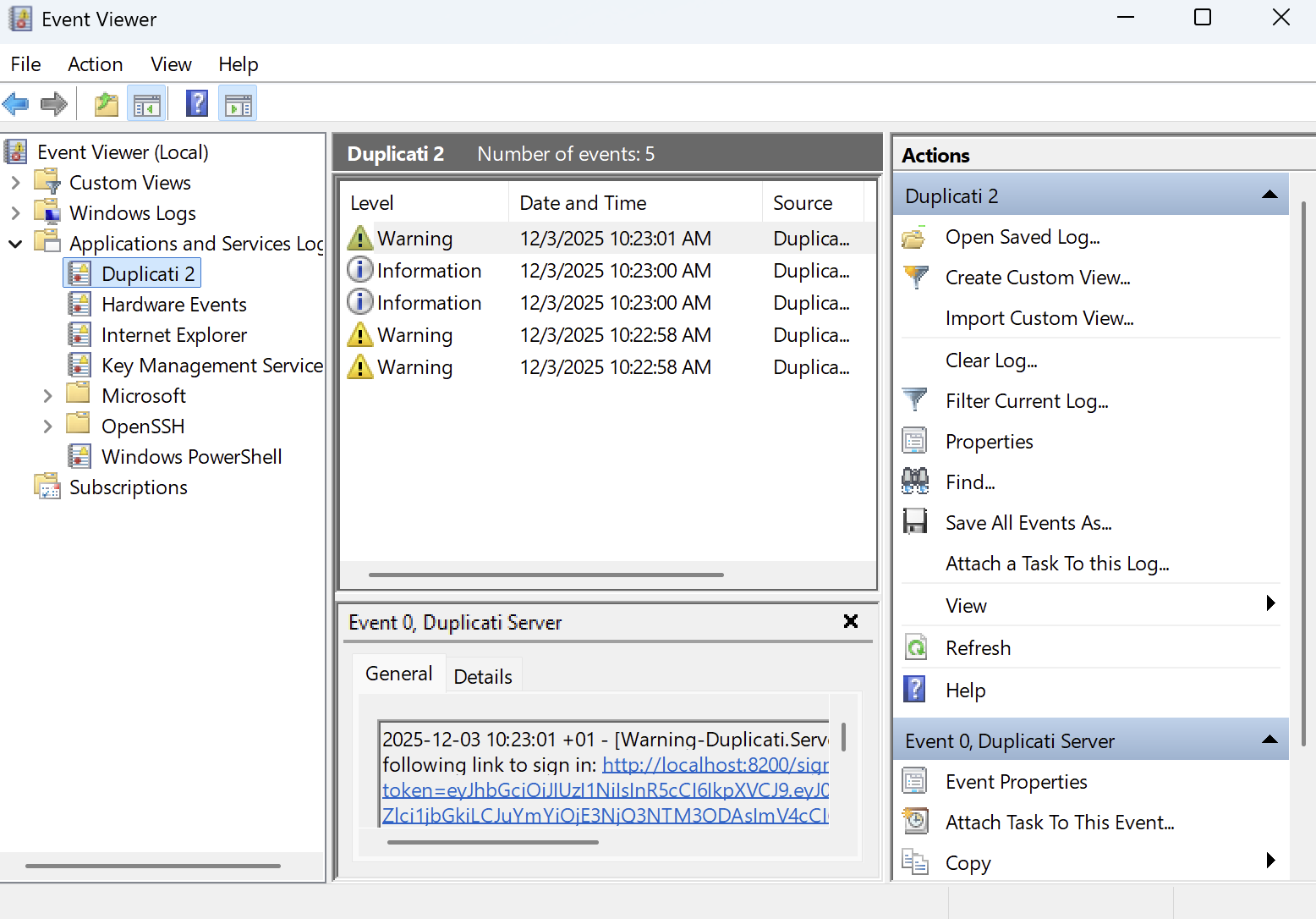 You can find the logs under “Applications and Services Logs” and the “Duplicati 2”: