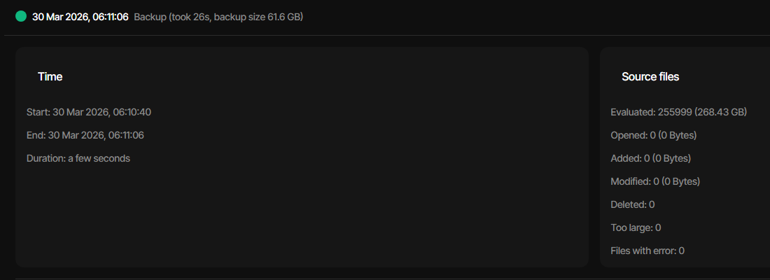 "2026-03-23 09:30:47 +01 - [Information-Duplicati.Library.Main.BasicResults-BackendEvent]: Backend event: Put - Completed: duplicati-ic5581dec5dd34fa48e820cb0d428a62a.dindex.zip.aes (813 bytes)",