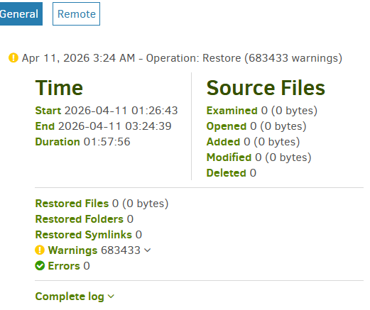 I am having a lot of trouble restoring a data drive with about 6 TB of files on Windows 11. My C: drive was not affected and so my local database from my routine backups was in pristine condition. During my first attempt at a restore to an empty data disk, essentially nothing was saved to the data disk after a dozen hours or so… one or two very large files. I discovered the bug that I reported here where the download function goes rogue: