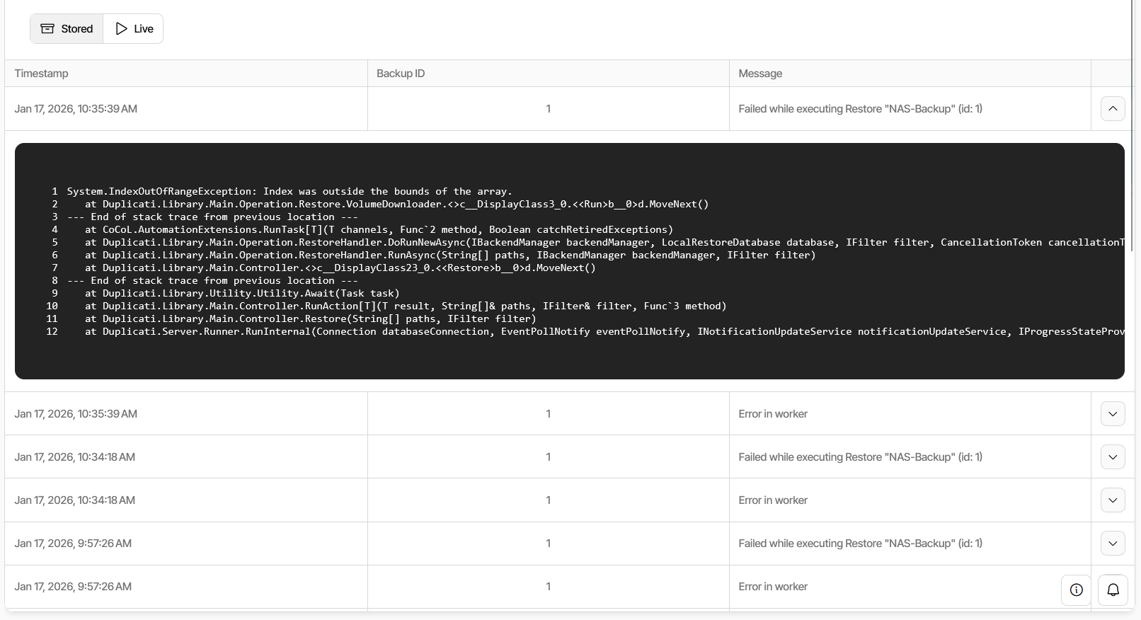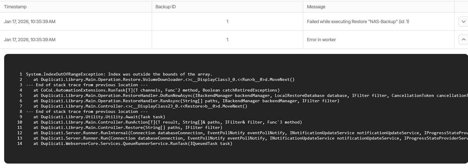 Permissions Check: I confirmed the container has write access to the restore folder. When I try to restore to a Read-Only mount, I get a proper “Permission Denied” error, but when pointing to a writable volume, I get the Array Index error instead.
