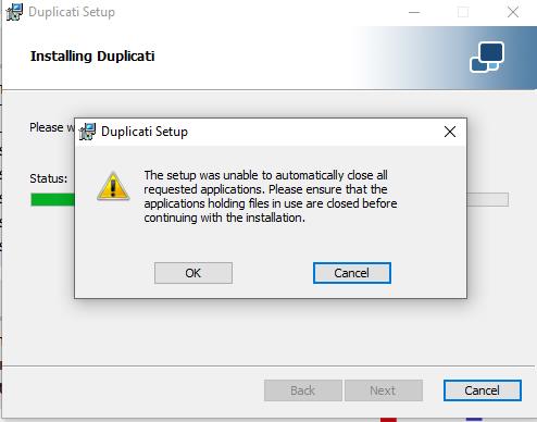 installation continued as if everything was OK. However “About” (after restarting Dup) showed that the update was not running. Only after I killed the tray icon process and ran another update (= repair) the new version was launched.