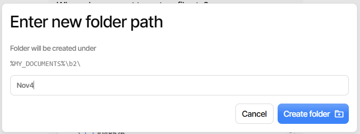 Using “Browse path” → “My Documents”, “b2” → click “Create folder” below tree, type Nov4