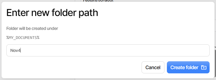I just tried that in 2.2.0.0 new UI as %MY_DOCUMENTS%\Nov4 and got new folder with my files.